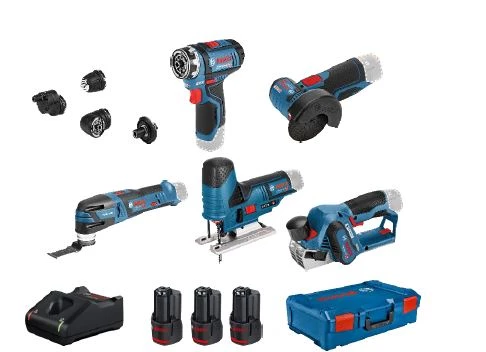 Bosch 0615A0017D 5 Toolkit 12V – Perceuse sans-fil + Meuleuse d’angle + Scie sauteuse + Raboteuse + Multitool 12V 2 x 2.0Ah/1 x 3.0Ah in XL-Boxx